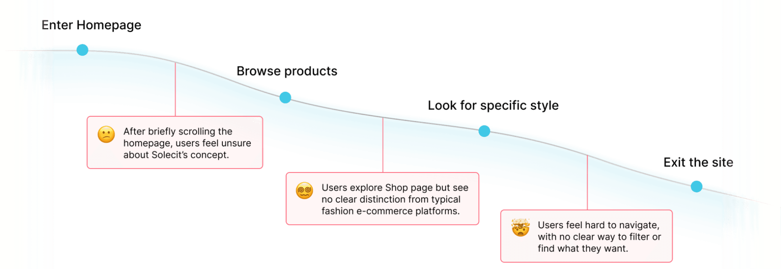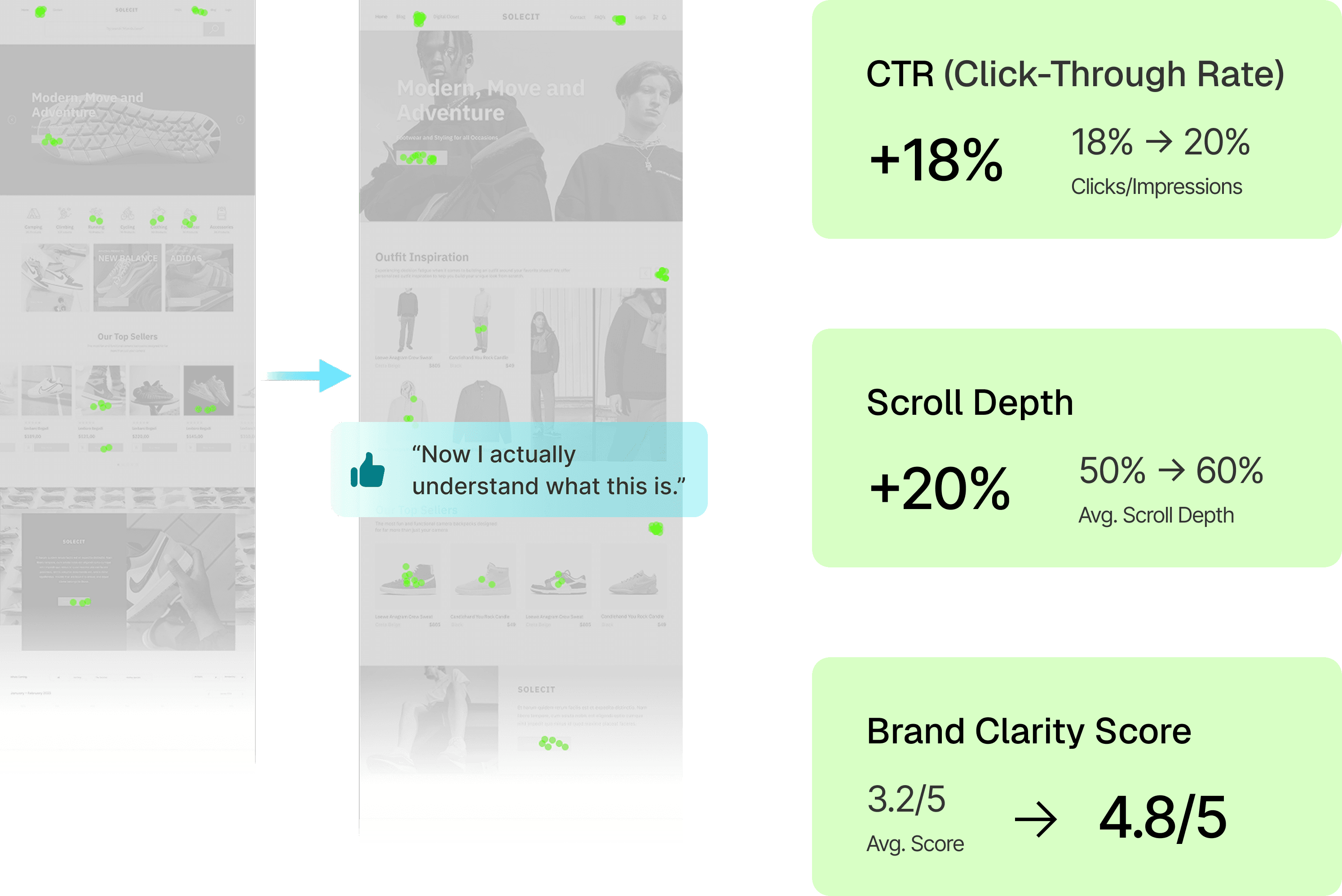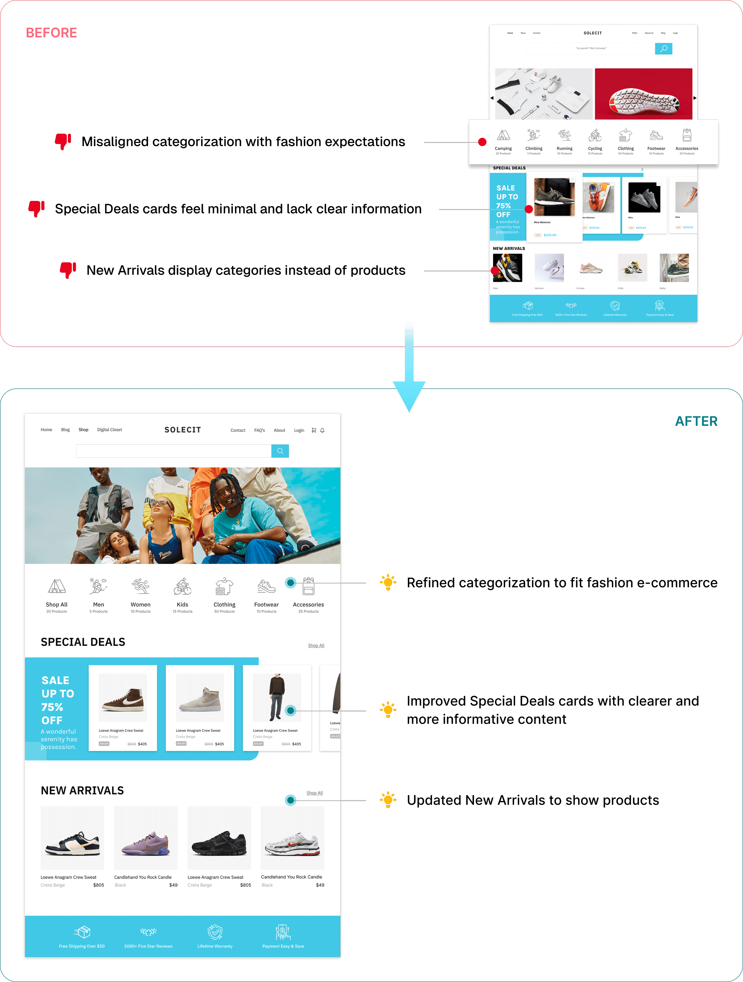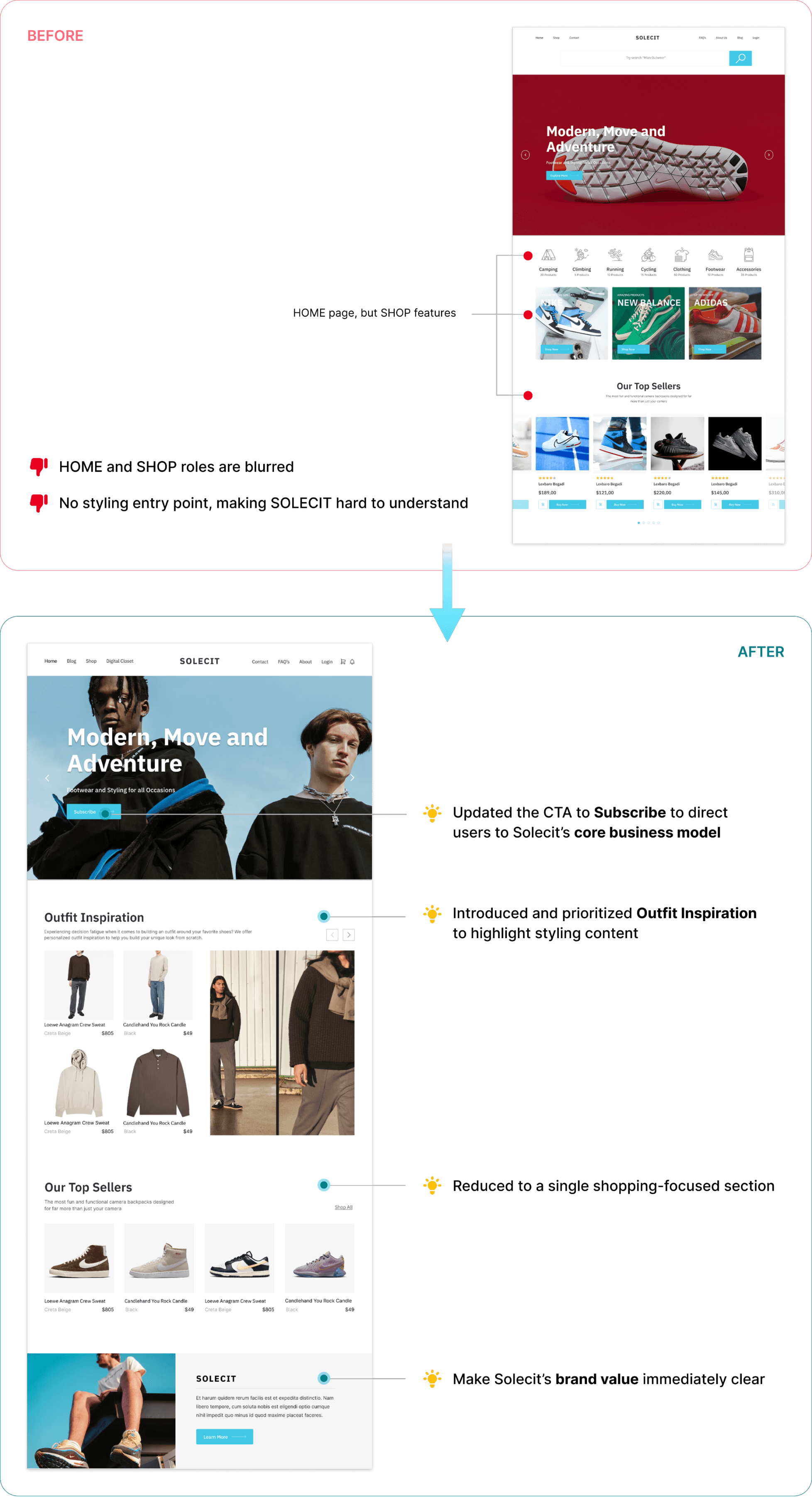The homepage blurred with Shop and felt generic, failing to communicate Solecit’s brand value. The redesign simplified content and introduced a clear styling entry point.