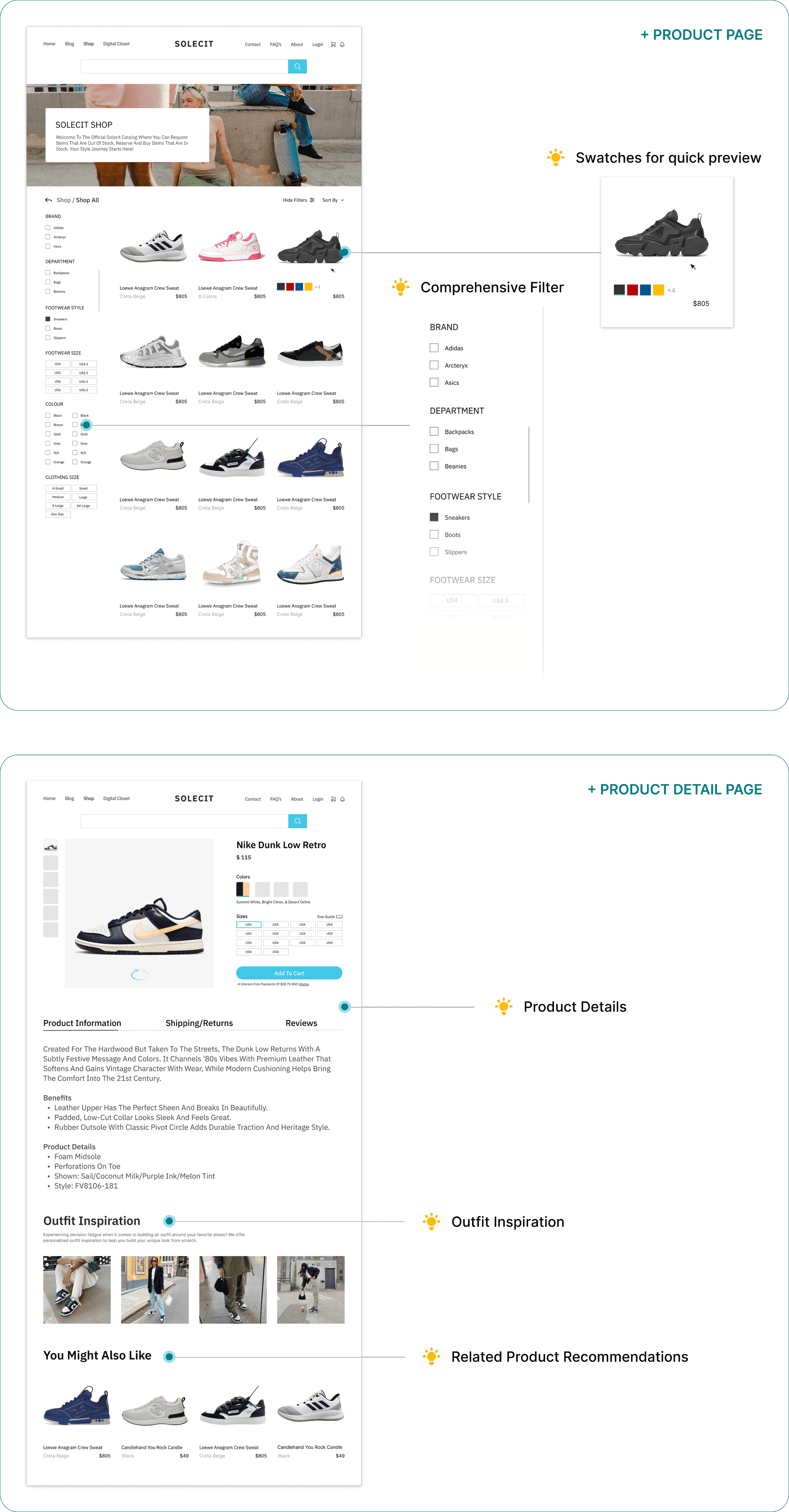 Introduced Product and Product Detail pages integrating outfit inspiration, swatches, and recommendations to provide richer context and better showcase Solecit’s styling expertise.