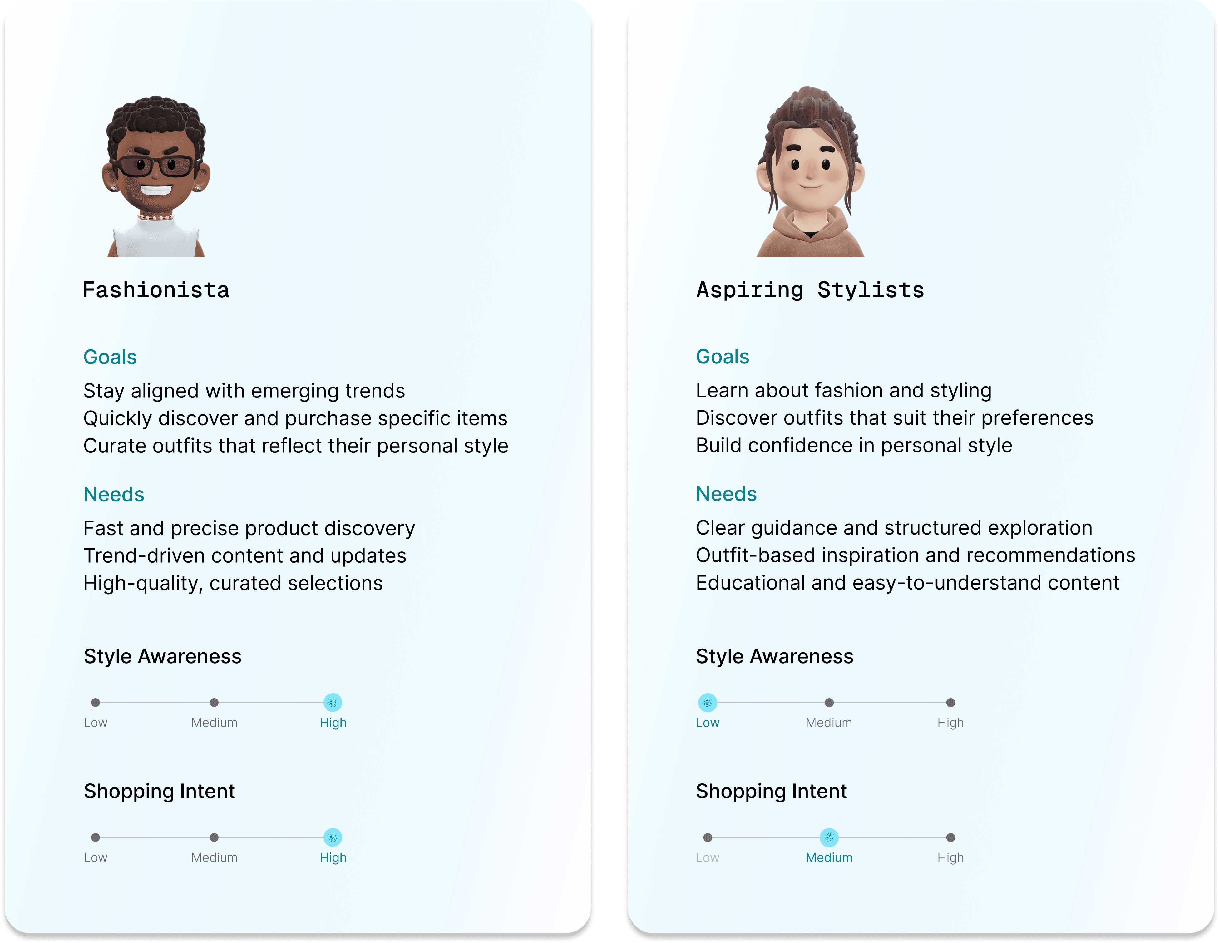 => Users vary in styling knowledge and purchase intent, requiring the design to accommodate both guidance and efficiency.
